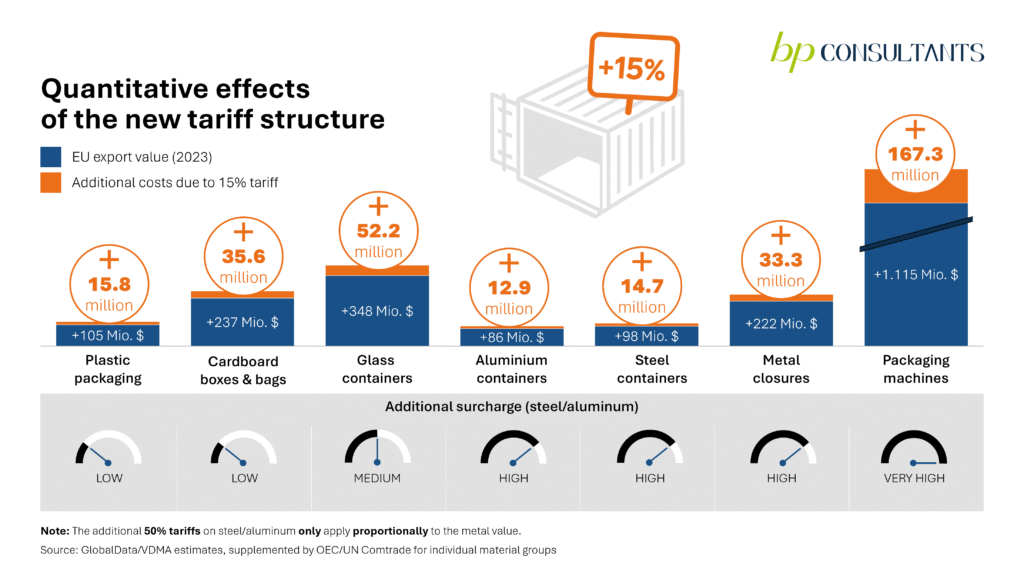 The new US tariff policy under Trump is placing a considerable strain on the European packaging industry. This applies to almost all material fractions and, in particular, to the packaging machinery sector. We provide you with a concrete overview for the EU, Switzerland, and the UK as well as illustrate the quantitative effects. We also identify the strategic responses needed to remain successful in transatlantic business.
