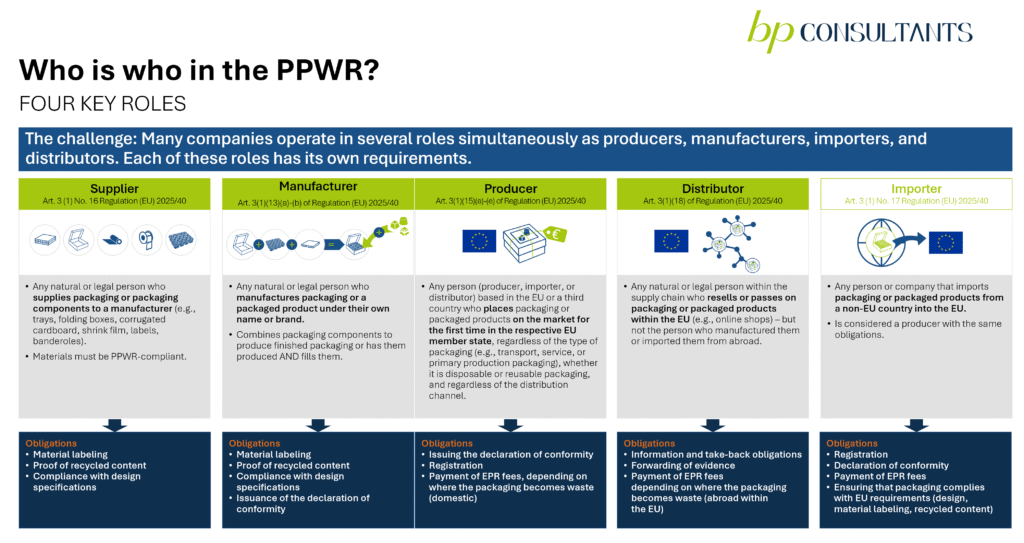 For more information and further explanations and examples, take a look at the detailed PPWR Summer Camp by Dr. Martin Engelmann, Managing Director of the German Plastics Packaging Industry Association (start here) and the BP White Paper PPWR. At the end of this article, you will also find an extended overview with a more detailed definition of the roles and explanations of other market players (authorized representative, distributor, etc.).